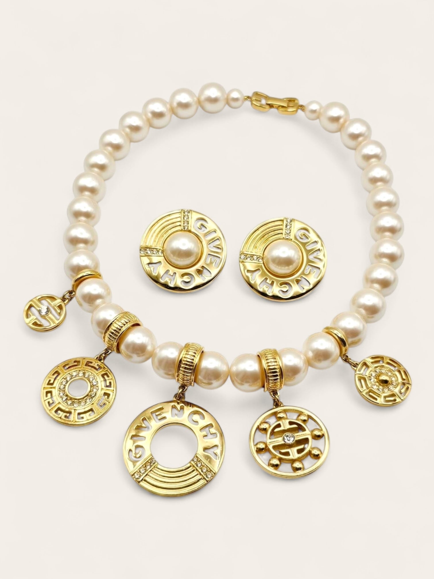 Givenchy pearls choker necklace and earrings set (vintage) : Approx. Necklace 53 cm, earrings 4 cm Material: Imitation pearls, and gold plated metal Condition: Very good vintage condition