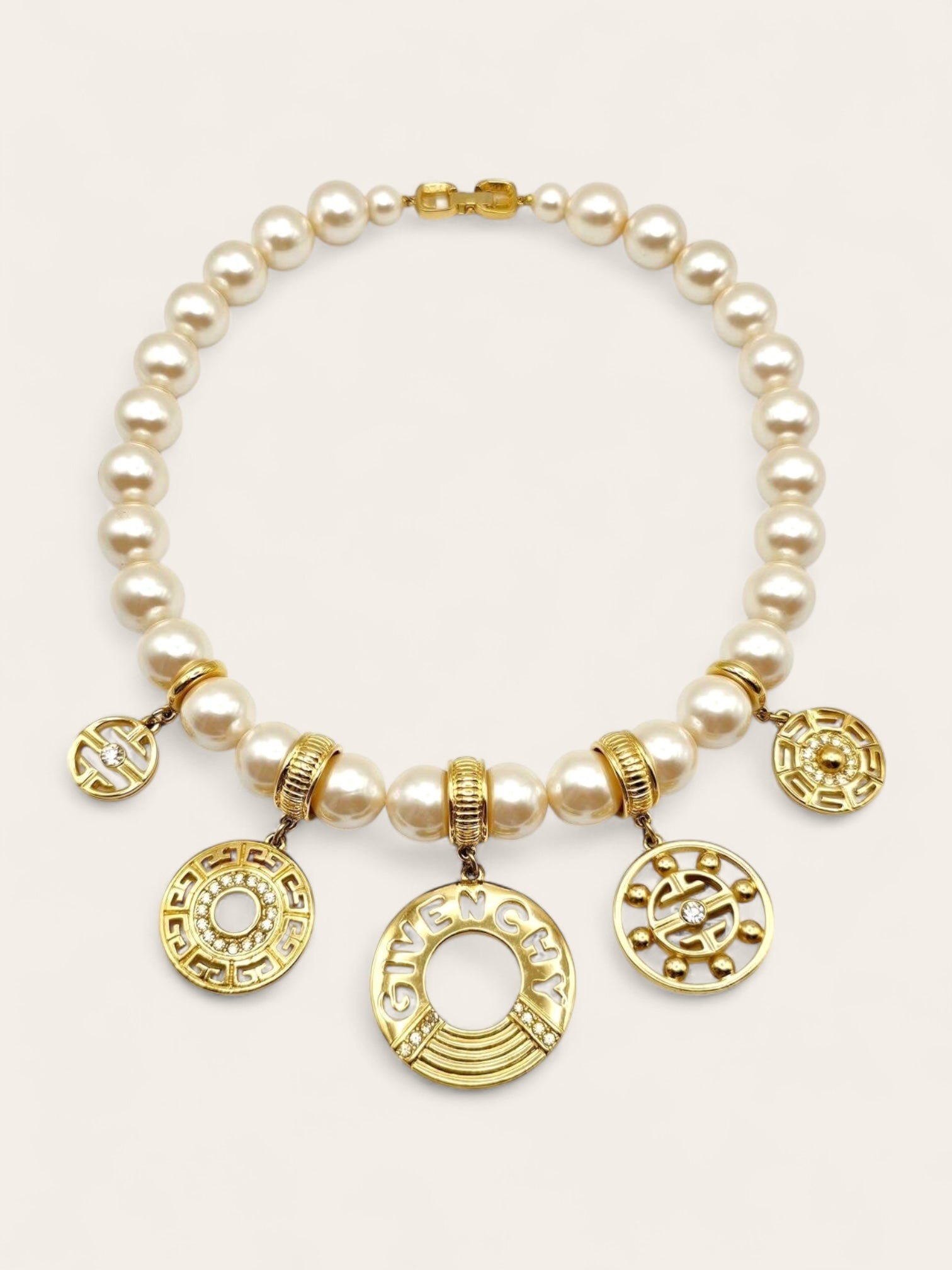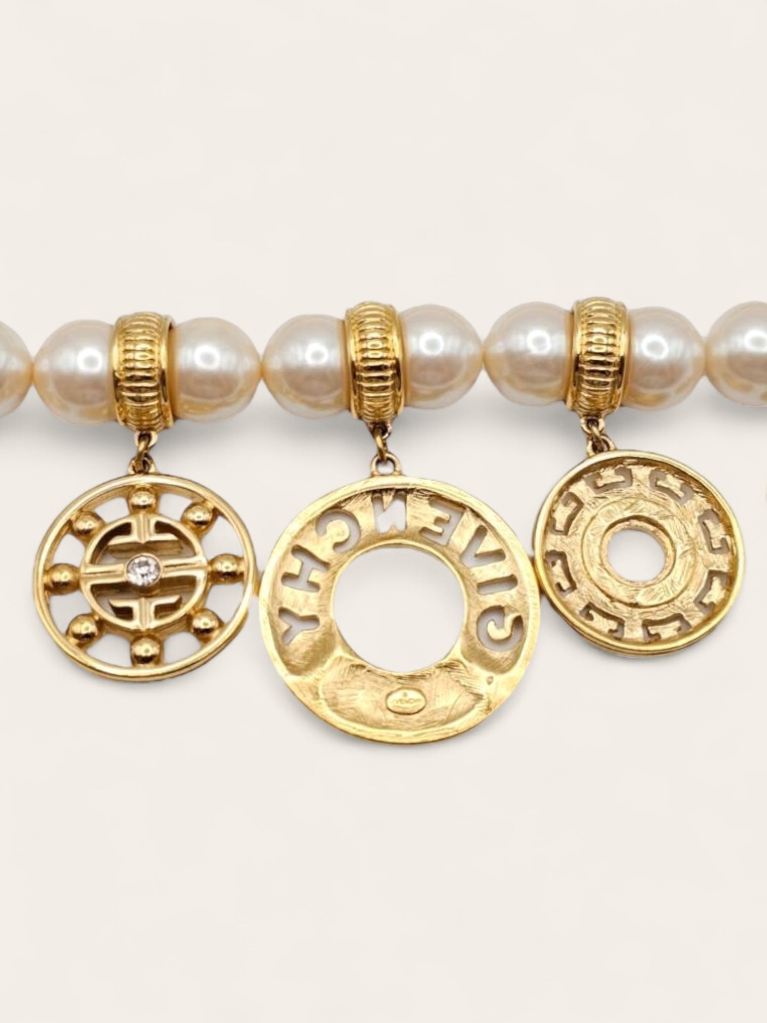 Vintage Givenchy Logo with Pearls Long Chain Necklace, Circa 1980s This elegant Givenchy long chain necklace from the 1980s features a luxurious blend of gold-plated metal, imitation pearls, and sparkling...