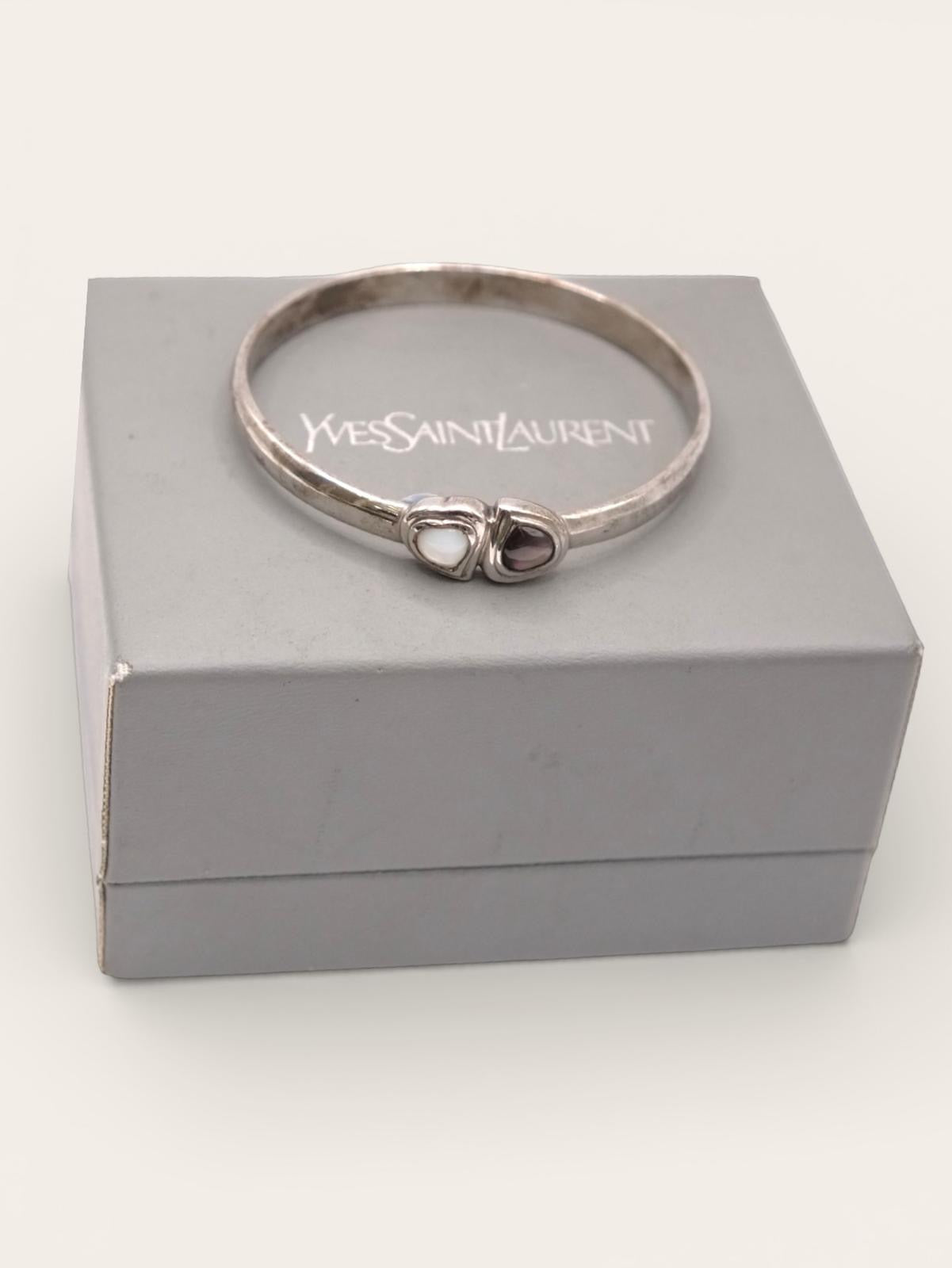 YSL Double Heart Silver Bangle Vintage Yves Saint Laurent sterling silver bangle featuring a sculptural double heart motif set with two smooth cabochon stones in contrasting tones, one light and...