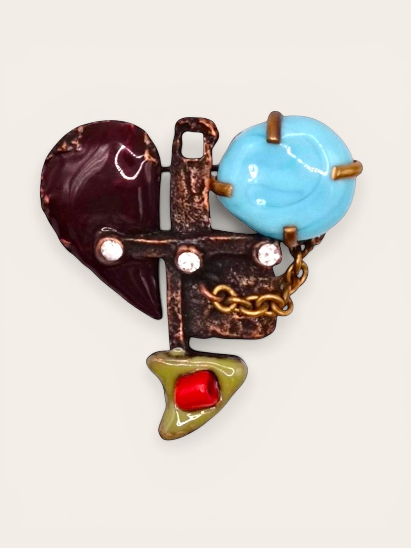 Vintage Christian Lacroix Brooch 1996 Christmas edition A striking vintage Christian Lacroix brooch from the 1996 Christmas edition, crafted in patinated copper-tone metal. The design features an asymmetrical abstract heart composition, combining...